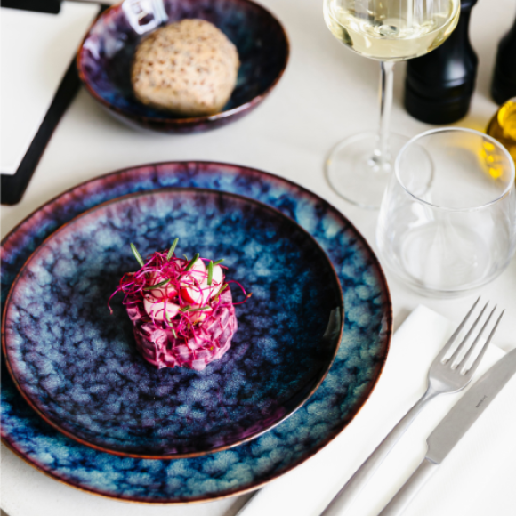 чорна та темно-синя глянцева реактивна глазур Hazy робить будь-яку страву особливою.